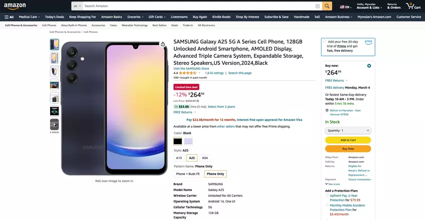 Samsung Galaxy A25 5G jest dostępny w kolorze czarnym i z 128 GB pamięci. Urządzenie sprzedawane jest z 12% rabatemcheck price on amazon).