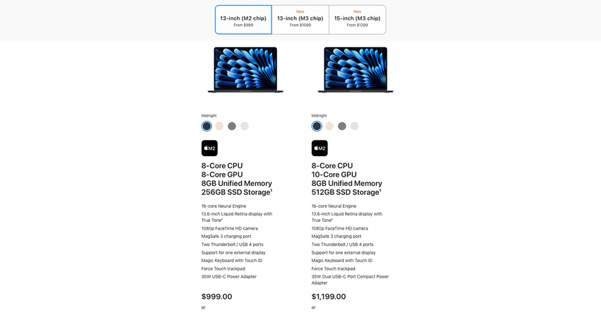 Obecnie najtańszym laptopem Apple jest zeszłoroczny 13-calowy MacBook Air z układem M2. Firma utrzymała urządzenie w sprzedaży, ale obniżyła cenę. Podstawowa wersja kosztuje 999 dolarów.