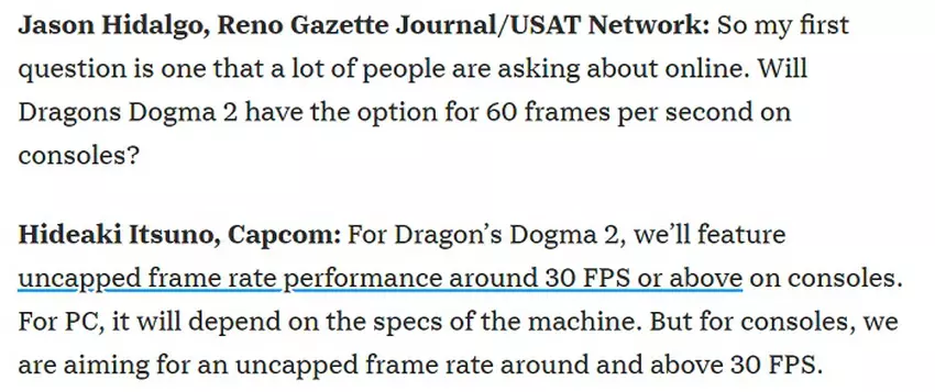 Dyrektor gry Dragon's Dogma 2, Hideaki Itsuno, potwierdził, że gra będzie działać w 60 FPS lub więcej tylko na PC.