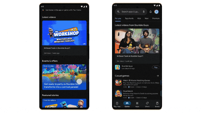 Google pozwoli również programistom wyświetlać najnowsze filmy z YouTube bezpośrednio w reklamach gier w Sklepie Play. Pomoże to przyciągnąć więcej użytkowników do gier. Firma wprowadziła również nowe, wciągające formaty reklam, które pasują do środowisk gier w różnych gatunkach.