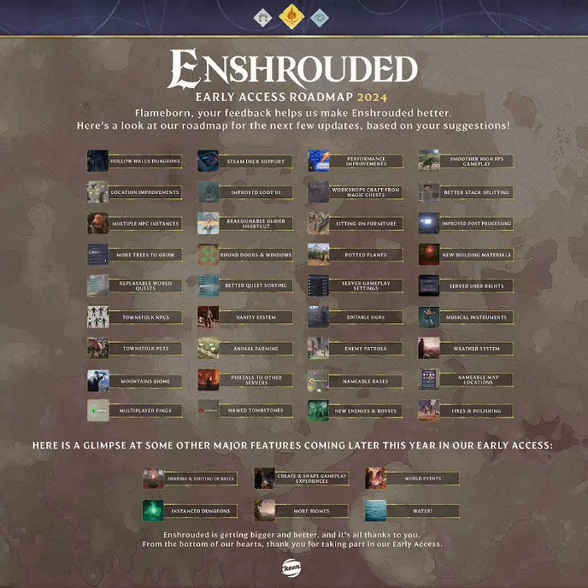 W 2024 roku Enshrouded powinno mieć wiele nowych funkcji, mechanik, wrogów i wiele więcej. Deweloperzy zauważyli, że wiele z ich pomysłów odzwierciedla życzenia graczy, więc są pewni słuszności swoich działań.
