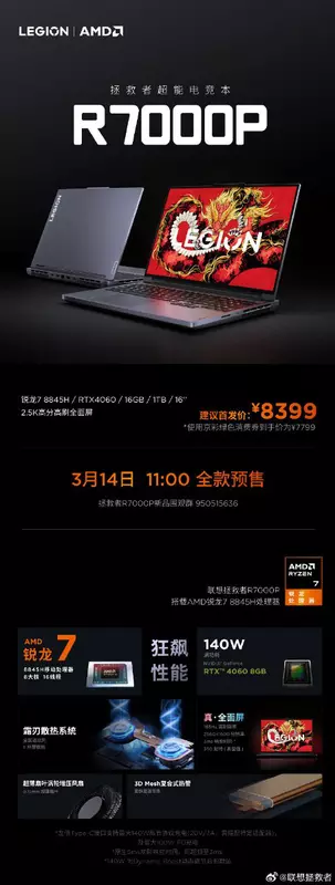 Nowy model jest znaczącym ulepszeniem w stosunku do swojego poprzednika, a głównym z nich jest procesor AMD Ryzen 7 8845H. Procesor ten ma 8 rdzeni i 16 wątków, z podstawową częstotliwością taktowania 3,8 GHz i przyspieszoną częstotliwością 5,1 GHz. Jest on również wyposażony w jednostkę NPU, dzięki czemu Legion R7000P może zapewnić wydajność AI do 38 TOPS, co znacznie zwiększa wydajność w aplikacjach intensywnie korzystających ze sztucznej inteligencji.