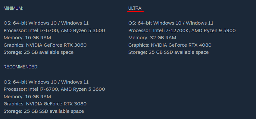 Wymagania systemowe "ultra" są nadal obecne tylko na stronie Portal z RTX. Wszystkie inne strony, tak jak poprzednio, mają tylko minimalne i zalecane wymagania.