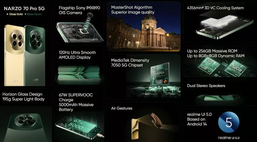 Realme Narzo 70 Pro 5G jest napędzany ośmiordzeniowym procesorem MediaTek Dimensity 7050 w połączeniu z 8 GB pamięci RAM LPDDR4X i 128/256 GB pamięci masowej. Gadżet jest wyposażony w skaner linii papilarnych pod ekranem, przedni aparat 16 MP i główny aparat 50 MP (Sony IMX890 z OIS) + 8 MP + 2 MP. Nowość posiada głośniki stereo i stopień ochrony IP54. Smartfon jest zasilany baterią o pojemności 5000 mAh. Urządzenie obsługuje szybkie ładowanie 67 W.