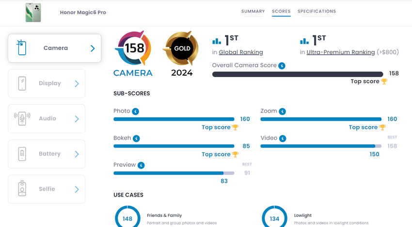 Według DxOMark, wiodącego autorytetu w ocenie aparatów smartfonów, Honor Magic6 Pro zdobył rekordowe 158 punktów, pokonując Samsunga Galaxy S24 Ultra, Huawei Mate 60 Pro+, iPhone'a 15 Pro Max i większość innych flagowych smartfonów.