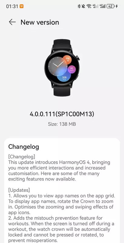 Mowa o HarmonyOS 4. Aktualizacja pojawiła się z numerem kompilacji 4.0.0.111 i waży 138 MB. System zaczął już falami trafiać do zegarków na całym świecie. Dostępność OTA można sprawdzić w aplikacji na smartfonie.