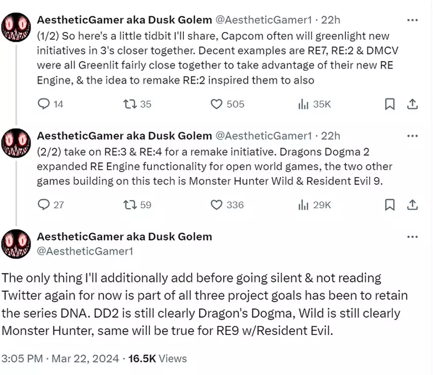 Dusk Golem rozwija tę myśl i uważa, że pierwszą z trzech ostatnich gier była Dragon's Dogma II. Następnie Monster Hunter Wilds, które powstaje na zaktualizowanej wersji silnika i również jest grą z otwartym światem. Podążając za logiką Dusk Golem, Capcom tworzy również Resident Evil 9 z tymi samymi koncepcjami i mechanikami, co dwie wyżej wymienione gry RPG.