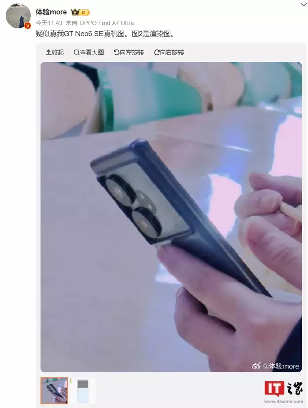 Jak donosi ITHome, użytkownik Weibo udostępnił wyciekły obraz ujawniający projekt tylnego panelu nowego Realme GT Neo 6 SE. Zdjęcie pokazuje, że smartfon ma duży prostokątny moduł kamery z tyłu. Moduł ten zawiera dwa okrągłe wycięcia na kamerę. Potwierdza to, że Realme GT Neo 6 SE będzie wyposażony w podwójny aparat główny.