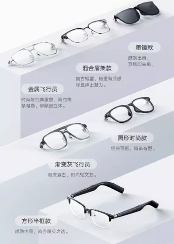 Model został nazwany MiJia Smart Audio Glasses. Nowość otrzymała sześć różnych oprawek i technologię przewodzenia dźwięku w powietrzu. Wewnątrz okularów znajdują się głośniki ultradźwiękowe, które wykorzystują algorytm syntezy wnęk dźwiękowych. Nowość posiada system redukcji szumów dźwięku podczas rozmów, a także specjalne czujniki, które rozpoznają położenie gadżetu. Na przykład podczas zdejmowania okularów muzyka jest automatycznie wstrzymywana.