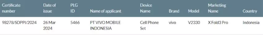 Gadżet o numerze modelu V2330 został zauważony w bazie danych indonezyjskiej agencji certyfikującej SDPPI. W związku z tym globalna premiera vivo X Fold 3 Pro nie jest odległa. Smartfon zadebiutuje prawdopodobnie w kwietniu lub maju.