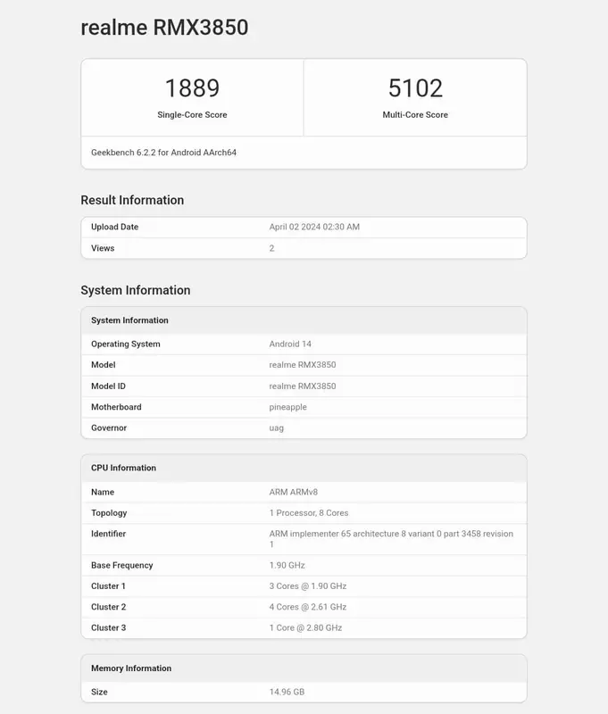 W testach porównawczych Geekbench, Realme GT Neo 6 SE uzyskał odpowiednio 1,889 i 5,102 punktów w testach jednordzeniowych i wielordzeniowych. Dodatkowe szczegóły na temat smartfona w Geekbench nie zostały ujawnione.