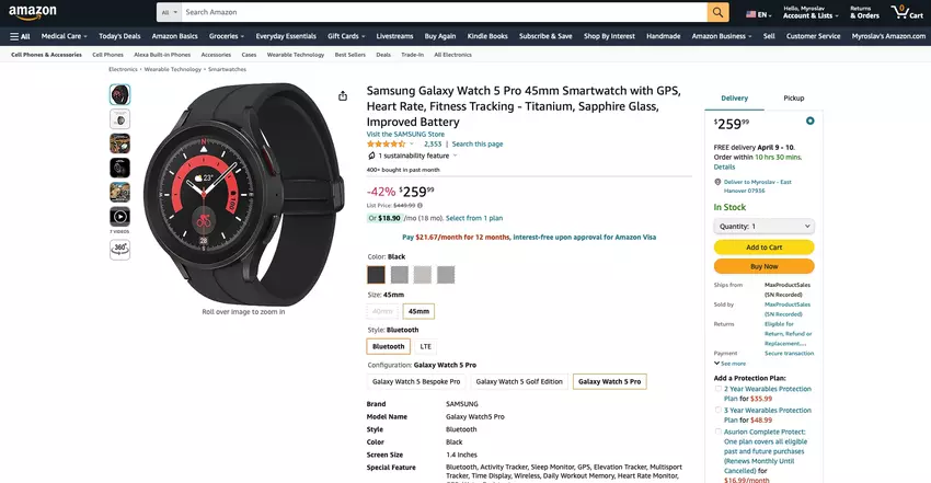 Samsung Galaxy Watch 5 Pro z tytanową kopertą 45 mm i szafirowym szkiełkiem jest dostępny na Amazon ze zniżką do 192 USD