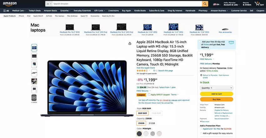 15-calowy MacBook Air z układem M3 dostępny za 150 USD taniej na Amazon