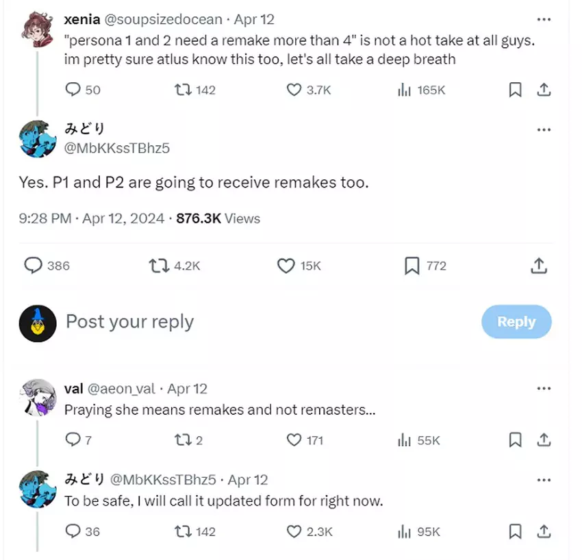 Rozmawiając z subskrybentami X, Midori ujawnił, że trwają prace nad remake'ami pierwszej i drugiej części Persony. Jednak później wyjaśnił, że w tej chwili nie ma dokładnych informacji na temat zakresu aktualizacji gier, więc na razie Midori uważa, że słuszne jest mówienie o ponownych wydaniach Persona 1 i Persona 2 na nowoczesne platformy, ale czy będą to remaki czy remastery - nie jest jeszcze pewien.