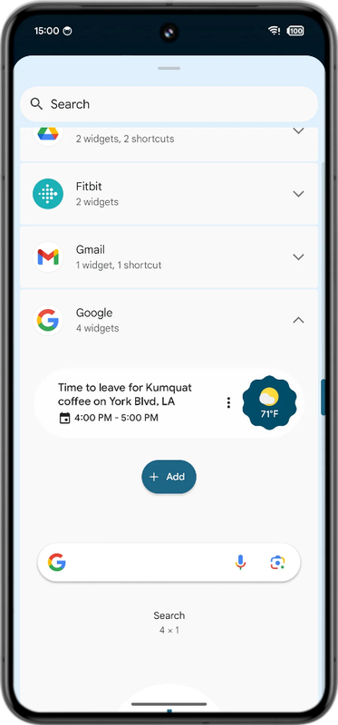 Kolejnym ulepszeniem związanym z widżetami w Androidzie 15 jest dodanie przycisku "Dodaj" do selektora widżetów Pixel Launchera. Przycisk ten ułatwia dodawanie widżetów do ekranu głównego, ponieważ nie trzeba już dotykać i przytrzymywać, a następnie przeciągać widżetu. Zamiast tego możesz po prostu dotknąć "Dodaj", a Pixel Launcher automatycznie doda wybrany widżet do pustego miejsca na ekranie głównym.