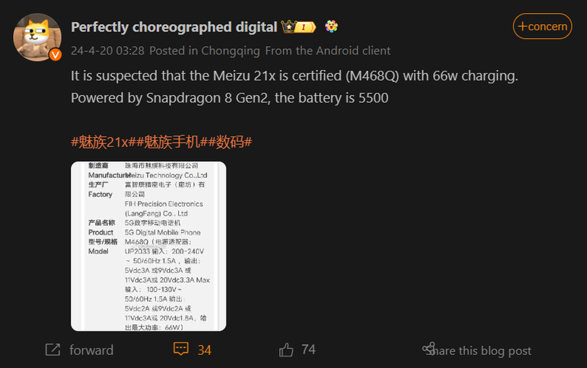Teraz inny chiński bloger podzielił się informacją, że urządzenie o numerze modelu M468Q w certyfikacji 3C obsługuje ładowanie 66W, które uważa się za Meizu 21X.
