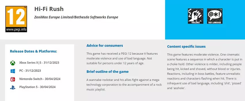 Na stronie agencji kwalifikacyjnej Pan European Game Information (PEGI) ujawniono klasyfikację wiekową Hi-Fi Rush w wersji na Nintendo Switch. Podobnie jak w przypadku innych platform, gra jest zalecana dla osób powyżej 12 roku życia ze względu na kreskówkową przemoc i zawoalowane wulgaryzmy.