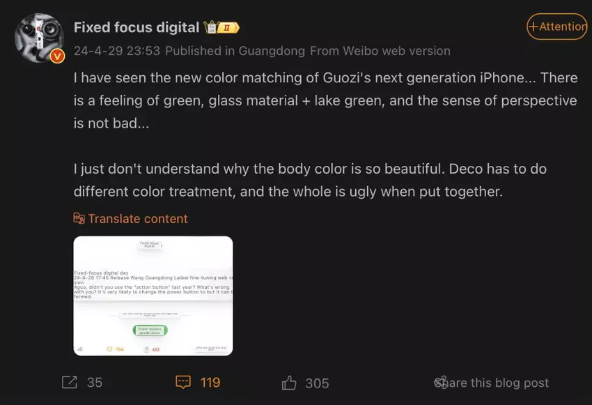 Inicjator przecieku, źródło informacji "Fixed Focus Digital ", podał szczegóły dotyczące możliwego koloru, wskazując na jego atrakcyjny wygląd. Chociaż dokładny odcień pozostaje tajemnicą, prawdopodobnie będzie różnił się od poprzednich zielonych wariantów iPhone'a, w tym Alpine Green iPhone 13 Pro.