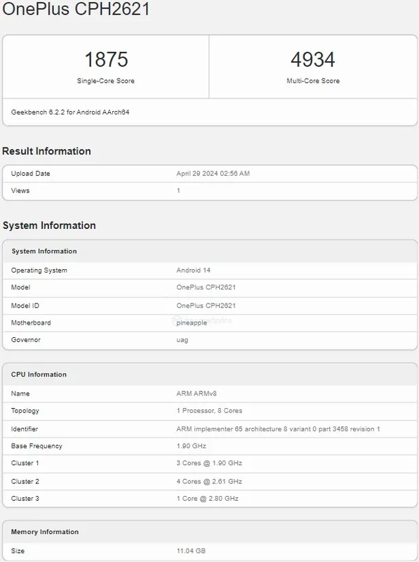W Geekbench, CPH2621, rzekomy OnePlus Nord 4, uzyskał wynik 1,875 w teście jednordzeniowym i 4,934 w teście wielordzeniowym. Testowany prototyp miał 12 GB pamięci RAM, ale oczekuje się, że wersje z większą ilością pamięci RAM będą dostępne w momencie premiery. Urządzenie działa pod kontrolą systemu Android 14, co jest dość oczekiwane. Będzie również dostarczane z systemem OxygenOS 14.
