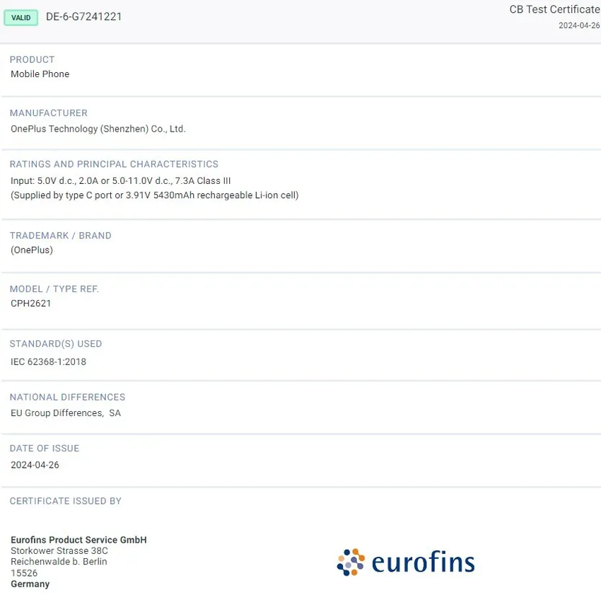 Podczas procesu certyfikacji Eurofins potwierdzono, że urządzenie ma dużą baterię 5430 mAh. Przypuszczalnie typowa pojemność będzie wynosić 5500 mAh, czyli tyle samo, co OnePlus Ace 3V. Jedyną zauważalną różnicą jest potwierdzenie obsługi ładowania 80W w tym certyfikacie, co różni się nieco od 100W oferowanego przez OnePlus Ace 3V.