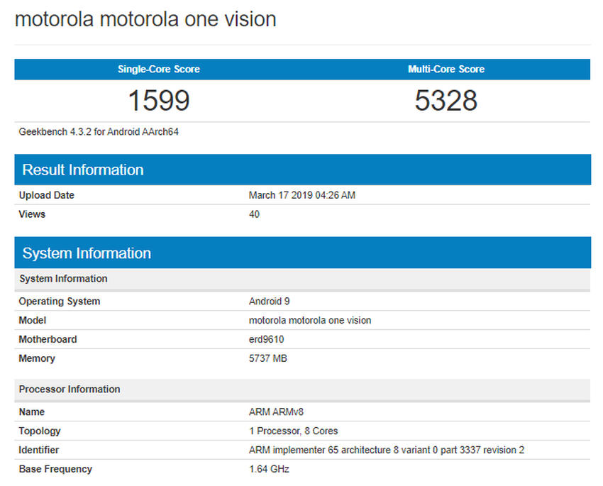 W bazie danych testu zauważyliśmy urządzenie Motoroli o nazwie «One Vision». Można przypuszczać, że jest to nazwa kodowa smartfonu Motorola P40. Nowość pracuje na 10-nanometrowym procesorze  Samsung Exynos 9610. Ma również 6 GB pamięci RAM i wersji Android OS 9 Pie.
