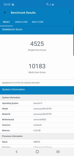 Tradycyjnie linia Samsung Galaxy S10 dostępna jest w dwóch wersjach: z Qualcomm Snapdragon 855 dla USA i Kanady i z firmowym Samsung Exynos 9820 dla reszty świata. Jest to - nowy procesor flagowy, który jest wykonany po procesu 8 nm LPP (Low Power Plus) FinFET. Jego konfiguracja nie jest całkiem normalną. Procesor zawiera dwa potężnych dostosowanych rdzenia Mongoose M4 o maksymalnej częstotliwości roboczej 2,73 GHz Dwa ARM Cortex-A75 do 2,31 GHz i cztery energooszczędnego ARM Cortex-A55 w 1,95 GHz dla najbardziej skromnych zadań. Oczywiście, jak w każdym nowoczesnym procesorze top-end,jest moduł do uczenia maszynowego i pracy z sieciami neuronowymi Neural Processing Unit (NPU),za grafikę jest odpowiedzialna ARM Mali-G76 MP12. Tradycyjnie rozwiązania Mali skromniejsze niż Adreno, choć w praktyce nie ma problemów z wydajnością w grach. Tylko niektóre używane trochę łatwiejsze tekstury (w porównaniu z Snapdragon 845):