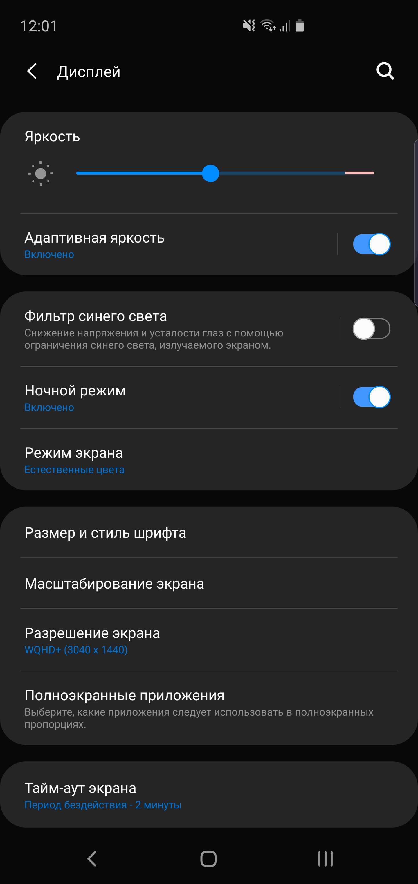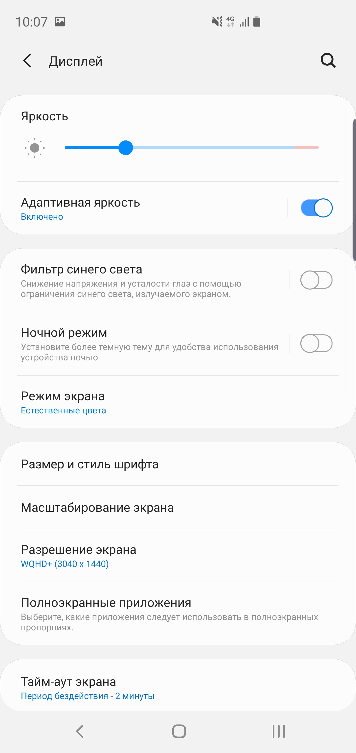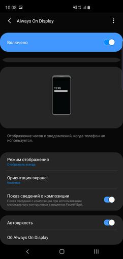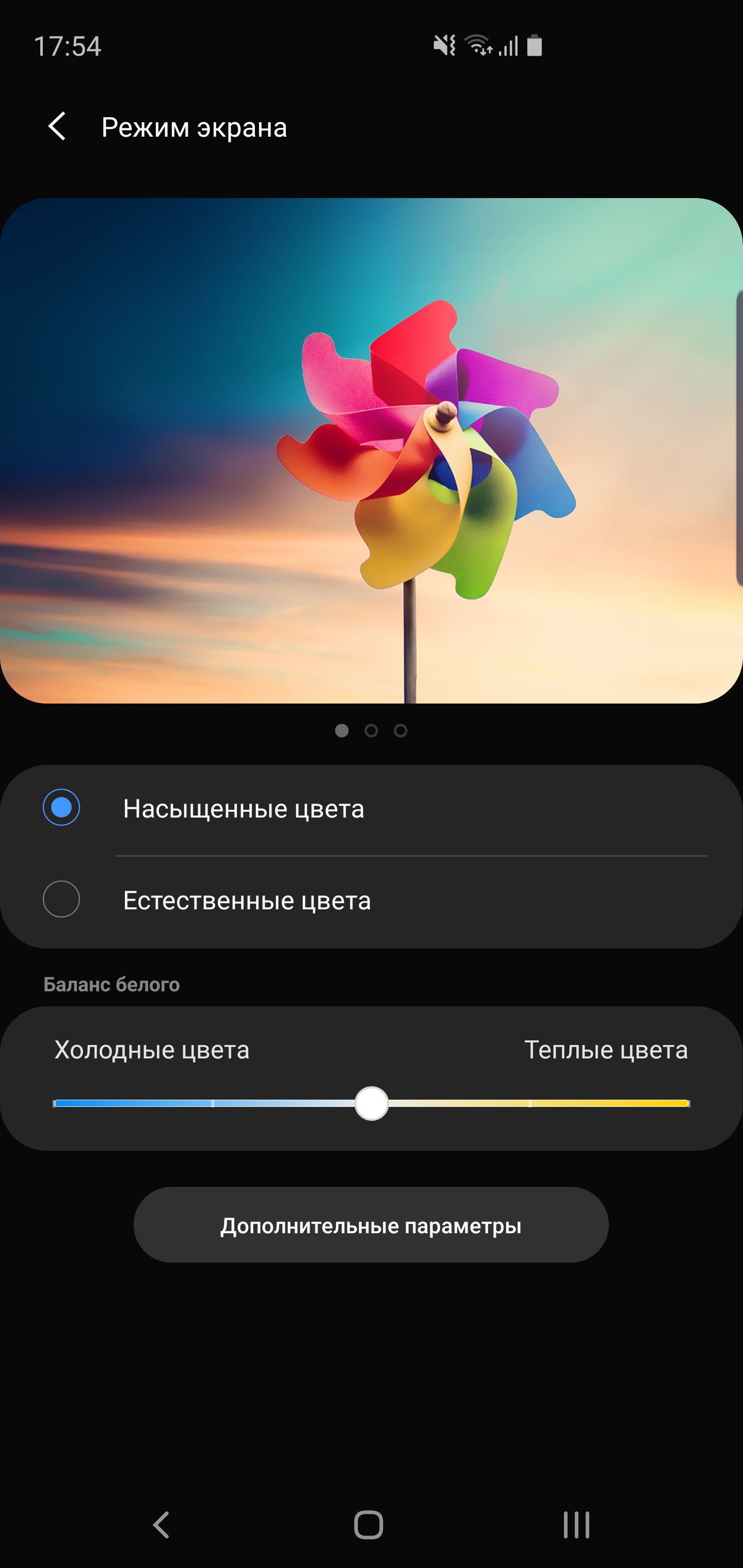 Wcześniej we flagowych Samsung miał dużo trybów wyświetlania: „adaptacyjny”, „podstawowy”, „AMOLED Movie”, „Photo AMOLED”. Teraz wszystko jest łatwiejsze, istnieją tylko dwa „nasycony” z ręczną regulacją barwy i „naturalny”. W rzeczywistości nazwa w pełni oddaje istotę trybów. Naturalny bliżej po kolorowej gamie do sRGB, nasycony - z rozszerzeniem typowym dla AMOLED gamą kolorów, jaśniejszymi kolory i większą jasnością: