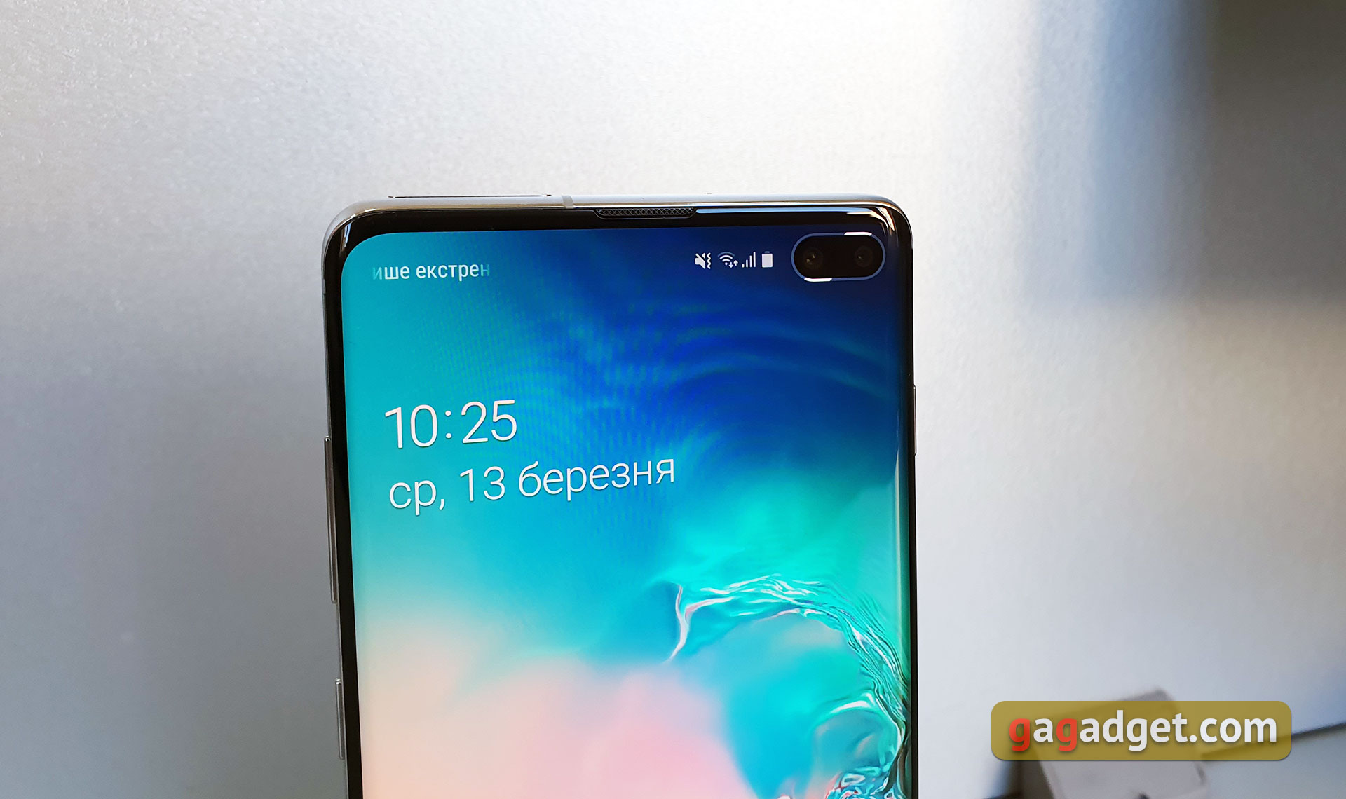 Kształt smartphone stał się nieco bardziej „prostokątny” w porównaniu do Galaxy S9 / S9 +, bliżej do Galaxy Note9. Powyżej wyświetlacza - mały otwór dla rozmownego głośnika. Ekran, oczywiście, z zakrzywionymi bokami, jest tradycyjna funkcja Always-On-Display: