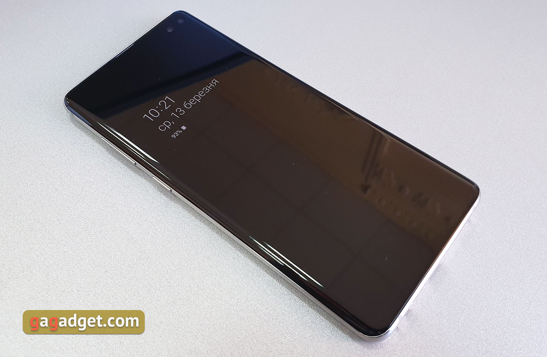 W smartphone ustawiony 6,4 calowy Infitity-O Dynamic AMOLED ekran z zakrzywionymi bokami, współczynnik stron 19: 9, zaokrąglone narożniki. Rozdzielczość jest 3040x1440 i gęstość pikseli - 522 ppi. Wyświetlacz obsługuje standard rozszerzonego dynamicznego zakresu HDR10 +, ogłoszona szczytowa jasności 800 cd / m2. Mimo że to jest bardzo specyficzne pojęcie: krótki pik na małym obiekcie w krótkim okresie czasu. Plus, wyświetlacz dostosowuje jasność do oświetlenia i przy jasnym słońcu jasność będzie wyższa. Nawiasem mówiąc, przednia kamera jest używana jako czujnik jasności.