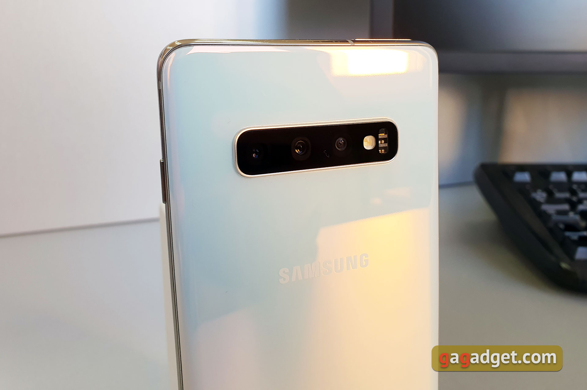 Samsung Galaxy S10 + otrzymała potrójną kamerę główną. Moduł główny na 12 megapikseli, zmienny otwór f / 1 / 5-2 / 4, kąt widzenia 77 °, wielkość piksela - 1,4 mkm, stabilizacja optyczna. Druga kamera - również MP 12, służy do powiększania, przesłona f / 2.4, stabilizacja optyczna, przy czym kąt 45 °, 1,0 mm rozmiar piksela, trzeci - szeroki kąt 16 MP, 123 ° F / 2.2. Ostatnia bez stabilizatora i autofokusa. Taki zestaw może rozmyć tło, zrobić 2-krotny zoom i ultraszerokokątne zdjęcia. Kamera umie pisać 4K 60k/s, HDR10 + i Super Slow Motion 960 fps przy rozdzielczości 1280x720 z możliwością wyboru czasu zapisu 0,2 i 0,4 sekundy, które są rozciągnięte. Przednia kamera składa się z 10 megapikselowego modułu f / 1.9 automatyczną regulacją ostrości i dodatkowego 8 Mp, f / 2.2. Ma tryb szerokokątny dla grupowych selfie.