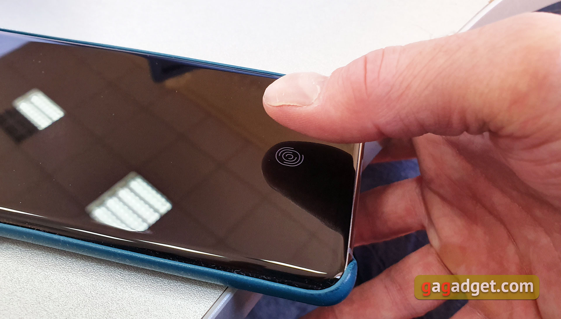 Zamiast tradycyjnego skanera linii papilarnych wykorzystuje się ultradźwiękowy, który jest wbudowany w ekran. Stwierdza się, że dobrze radzi sobie z mokrymi i brudnymi palcami, i w całości jest szybszy i dokładniejszy niż poprzednie rozwiązania wbudowane do wyświetlacza. On działa dokładniej, ale za prędkością jest znacznie gorszy od „tradycyjnych” skanery. Miejsce skanowania jest zaznaczone na wyświetlaczu.