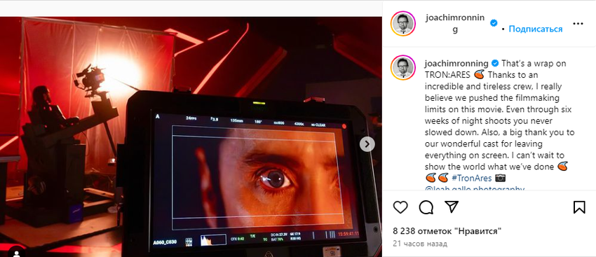 "Zdjęcia do filmu 'Tron: Ares' zakończone! Ogromne podziękowania dla naszej niesamowitej ekipy, która wykonała niesamowitą pracę. Nawet podczas sześciu tygodni nocnych zdjęć nie przestawaliście. Dziękuję również naszej niesamowitej obsadzie za ich całkowite zaangażowanie w zdjęcia. Nie mogę się doczekać, aby pokazać światu nasze dzieło sztuki".- napisał Ronning.