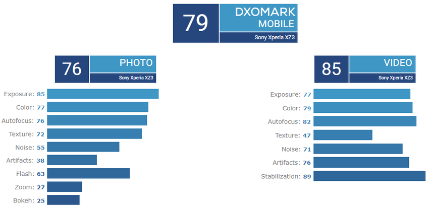 W rezultacie, zdjęcia Sony Xperia XZ3 dostały 76 punktów, wideo - 85. średnia wynosi 79 punktów za kamerę. Jest to o wiele gorzej niż dzisiejsze flagowych, które zdobywają ponad 100 punktów, a nawet urządzeń średniego segmentu. Na przykład wskaźniki są lepsze w iPhone 7, Asus Zenfone 5 a nawet Sony Xperia XZ Premium, wydanego w 2017 roku.