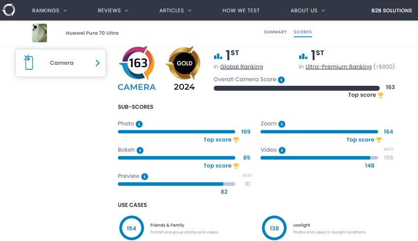 Wcześniej pozycję tę zajmował HONOR Magic6 Pro, a następnie Huawei Mate 60 Pro+ i OPPO Find X7 Ultra. Huawei Pura 70 Ultra zajął pierwsze miejsce z 163 punktami, czyli o 5 punktów więcej niż drugie urządzenie.