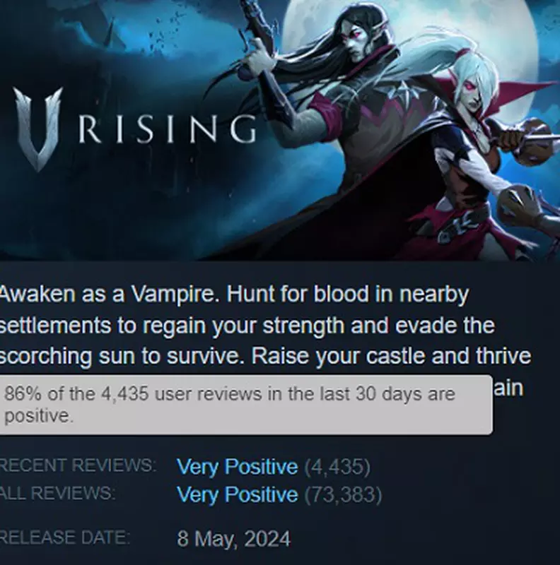 V Rising zbiera ogromną ilość pozytywnych recenzji. Warto zauważyć, że nawet w negatywnych recenzjach prawie nie ma żadnych zastrzeżeń do gry. Niektórzy gracze zauważają jedynie, że są zmęczeni grami podobnymi do Diablo, ale jakość V Rising jest na najwyższym poziomie.