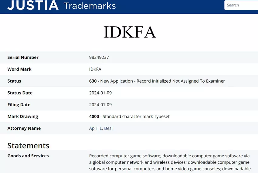 Na portalu Justia, który specjalizuje się w informacjach o stosunkach prawnych, znaleziono wzmiankę, że Bethesda złożyła wniosek o rejestrację znaku towarowego IDKFA 9 stycznia 2024 roku.