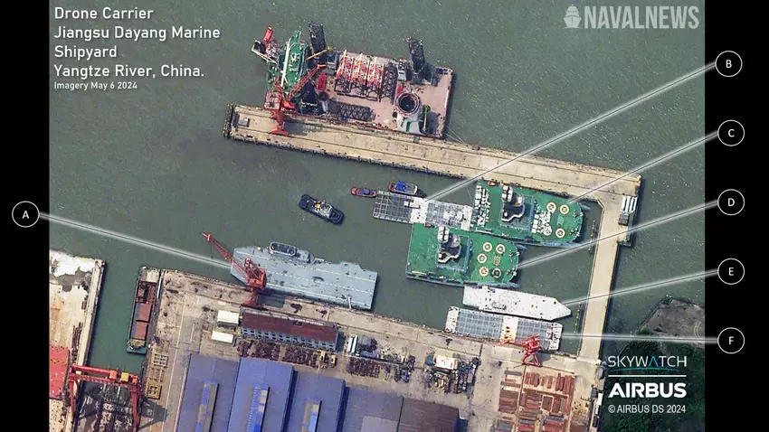 Wcześniej niezidentyfikowany lotniskowiec dronów (A) jest dłuższy, ale węższy niż dwa statki bazowe (C, D) zbudowane w tej samej stoczni. Istnieje również kilka zaawansowanych technologicznie barek docelowych (B, F), w tym jedna naśladująca lotniskowiec (E). Ilustracja: Naval News