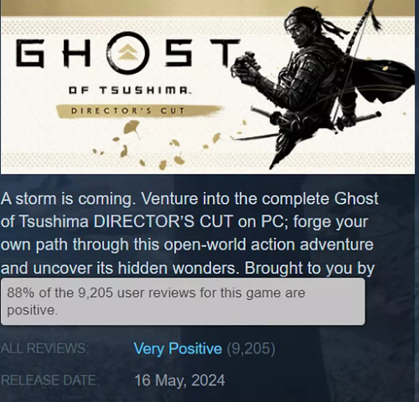 Dzięki doskonałemu wykonaniu technicznemu i początkowej najwyższej jakości, Ghost of Tsushima ma 88% pozytywnych opinii na Steam.