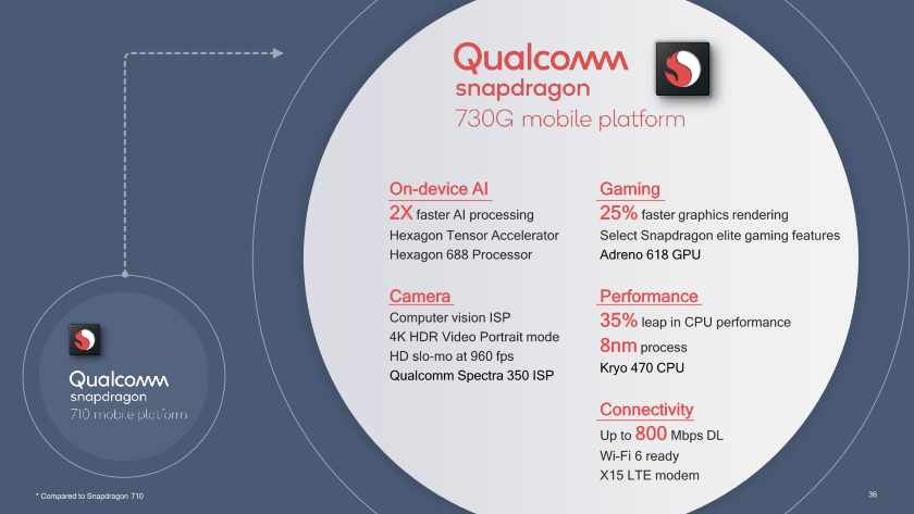 Wersja chipu Snapdragon 730g różni się od sojego młodszego brata podkręcony procesorem układu graficznego, który zwiększa wydajność o 15%. Również ten SoC obsługuje rozdzielczości ekranu do 1440p i opóźnione filmowanie do 960 k / s.