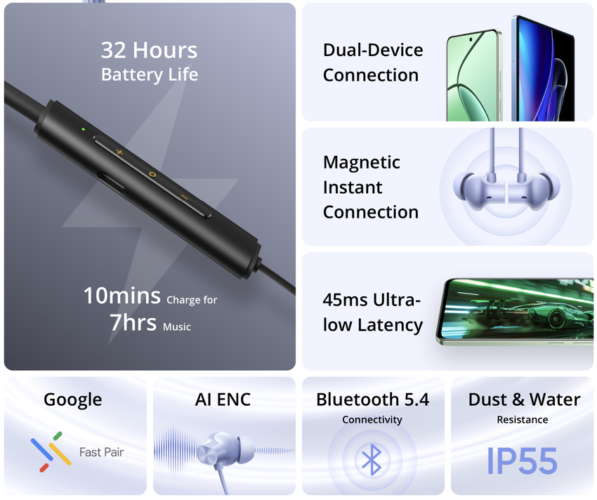 Nowość otrzymała obręcz do wygodnego noszenia i przetworniki 13,4 mm. Model może pochwalić się ochroną IP55 przed kroplami wody i potem, modułem Bluetooth 5.4, łącznością z dwoma urządzeniami, a także technologią Google Fast Pair do szybkiego parowania ze smartfonami z Androidem. Nowość posiada system redukcji szumów dźwięku podczas rozmów oraz tryb niskiego opóźnienia (45 ms). Jeśli chodzi o autonomię, to wystarczy ona nawet na 32 godziny słuchania muzyki.
