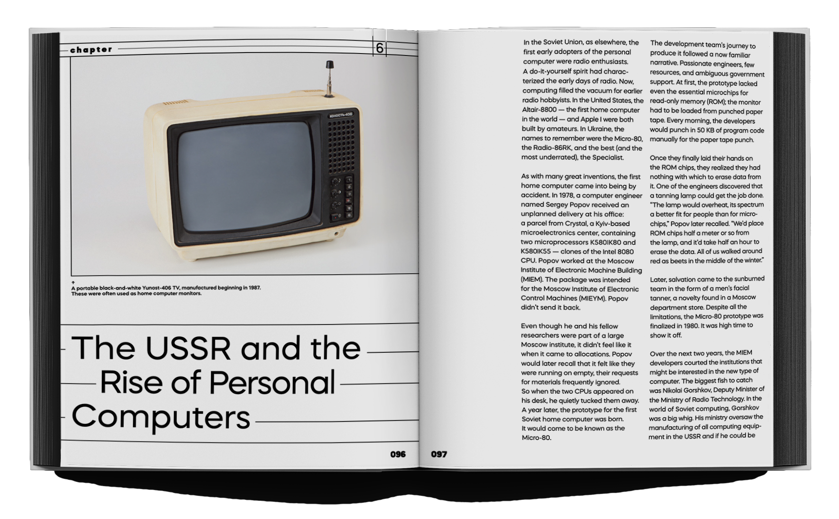 Pierwsza część książki obejmuje historię cybernetyki na Ukrainie od lat 40. do 1991 roku i jest ilustrowana dziesiątkami rzadkich zdjęć archiwalnych. Czytelnicy poznają zakulisowe aspekty tworzenia pierwszych komputerów na Ukrainie, wybitnych inżynierów i naukowców, którzy zapoczątkowali erę komputerów za żelazną kurtyną oraz warunki, w jakich pracowali. Historia technologii odtworzona w książce opiera się na dziesiątkach wywiadów z tymi, którzy osobiście znali kluczowych innowatorów tamtych czasów: kolegami, krewnymi i uczniami pionierów cybernetyki, Wiktora Głuszkowa i Siergieja Lebiediewa.
