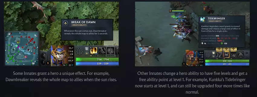 • Inne dodają dodatkowy poziom do zwykłej umiejętności i sprawiają, że jest ona dostępna od samego początku - na przykład Kunkka ma od razu umiejętność Tidebringer i może nauczyć się jej jeszcze cztery razy. To samo dotyczy Dowódczyni Legionu i jej umiejętności Chwila Odwagi.