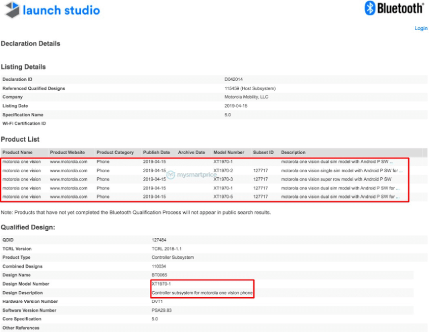 Oprócz Motorola Razr, na stronie Bluetooth SIG również zauważono smartfon Motorola One Vision z numerami modeli XT1970-1, XT1970-2, XT1970-3 i XT1970-5.