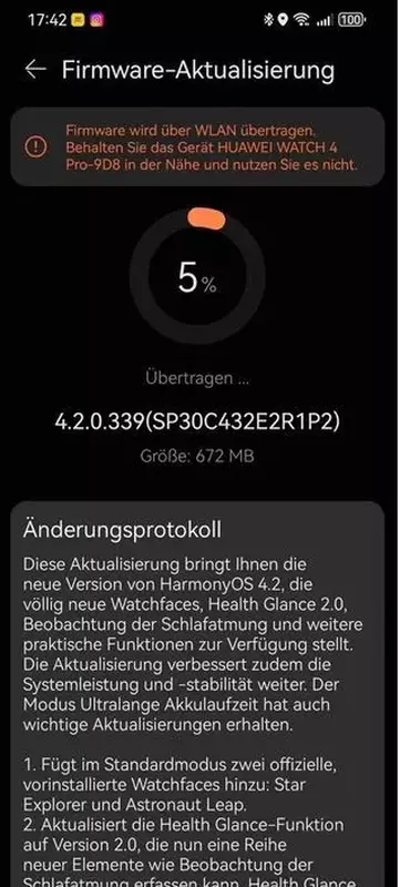 Wraz z aktualizacją HarmonyOS 4.2 smartwatch otrzymał dwie nowe tarcze zegarka: Star Explorer i Astronaut Leap. Ponadto Huawei dodał tryb Health Glance 2.0, wsparcie dla Huawei TruScreen 5.5+, funkcję monitorowania oddechu podczas snu, zaktualizowany kalendarz cykli i ulepszony tryb Ultra Long Battery Life. Deweloperzy zoptymalizowali jeszcze w firmware powiadomienia o przychodzących połączeniach Bluetooth.