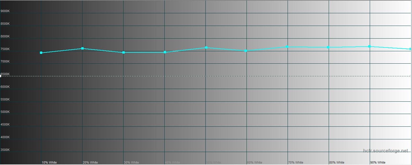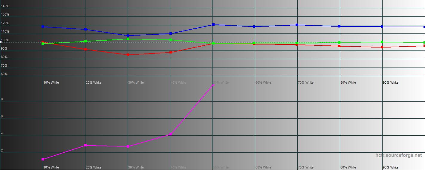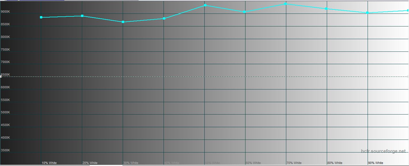 W trybie „Jasny” maksymalna jasność wynosi 447,247 cd / m2. W trybie jasnym obraz przechodzi w zimne odcienie: występuje nadmiar błękitu i niewielki brak czerwieni, temperatura koloru wynosi około 9000K, a pokrycie kolorów jest szersze niż sRGB: