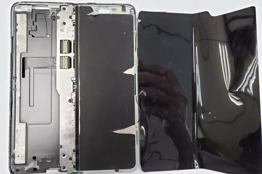 Sam użytkownik pisze, że 7,3-calowy ekran można łatwo usunąć, ale zdecydowanie nie można tego zrobić bez uszkodzeń. „Miałem wrażenie, że nie zdemontowałem ekranu, ale rozrywałem opony”, dzieli się swoimi wrażeniami. W rzeczywistości jest to zwykły elastyczny wyświetlacz AMOLED, tylko nie pod szkłem ochronnym (w zwykłych smartfonach, nadaje mu twardość), ale pod specjalną foliją. Przypomnijmy, Samsung zdecydowanie nie zaleca usuwania go - w przeciwnym razie można pożegnać się z ekranem roboczym.