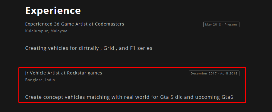 Jednocześnie profil artysty na LinkedIn pozbawiony informacji o projektach, w których brał udział. Rockstar monitoruje wycieki i nie pozwala pracownikom rozmawiać o projektach, więc wzmianka o GTA 6 może zostać uznana za naruszenie umowy. Zauważ też, że w styczniu 2019 r. Dywizja indyjska szukała „artysty samochodowego”, być może Michael spowodował brak personelu.