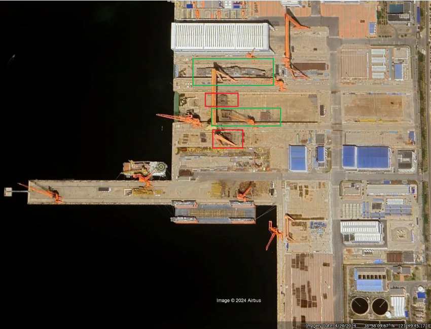 Zgodnie z nowymi komercyjnymi zdjęciami satelitarnymi, firma złożyła również kolejny niszczyciel typu 052D, szósty z najnowszej partii w stoczni. Widoczne są również belki dla nowych modułów - 18 i 20 metrów - co wskazuje na równoległą budowę w tym samym doku.