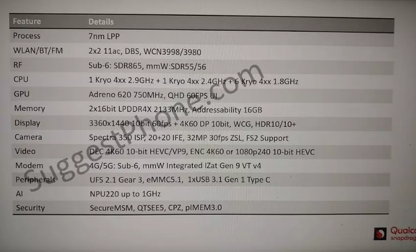 Dziennikarze edycji Suggestphone udostępnili zdjęcie dokumentu z cechami podstawowymi nowego SoC Snapdragon 735. Podobnie do topowego procesora Snapdragon 855 nowy produkt jest oparty na procesową technologię 7-nanometrową. Chip otrzyma osiem rdzeń z klastrami 1 + 1 + 6. Są one z identycznej serii (Kryo 400), ale z inną częstotliwością zegara. Pierwszy rdzeń, - 2,8 GHz, drugi - 2,4 GHz, pozostałe sześć - 1,8 GHz.