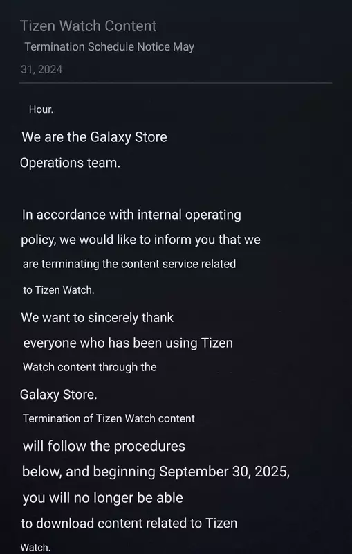 Zgodnie z harmonogramem opublikowanym przez użytkownika Reddit Seaweed_Maximum, sprzedaż płatnych treści dla zegarków Tizen zostanie wstrzymana do 30 września 2024 roku. Do 31 maja 2025 r. całkowicie zniknie możliwość pobierania darmowych aplikacji.